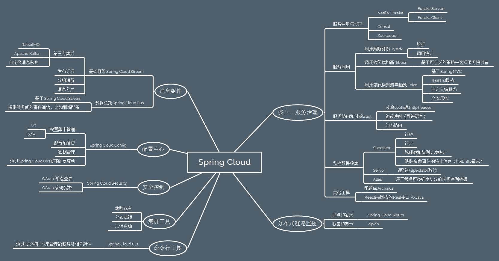 主要的成员有:Spring Cloud Config、Spring Cloud Netflix(Eureka、Hystrix、Zuul、Archaius…)、Spring Cloud Bus、Spring Cloud for Cloud Foundry、Spring Cloud Cluster、Spring Cloud Consul、Spring Cloud Security、Spring Cloud Sleuth、Spring Cloud Data Flow、Spring Cloud Stream、Spring Cloud Task、Spring Cloud Zookeeper、Spring Cloud Connectors、Spring Cloud Starters、Spring Cloud CLI。