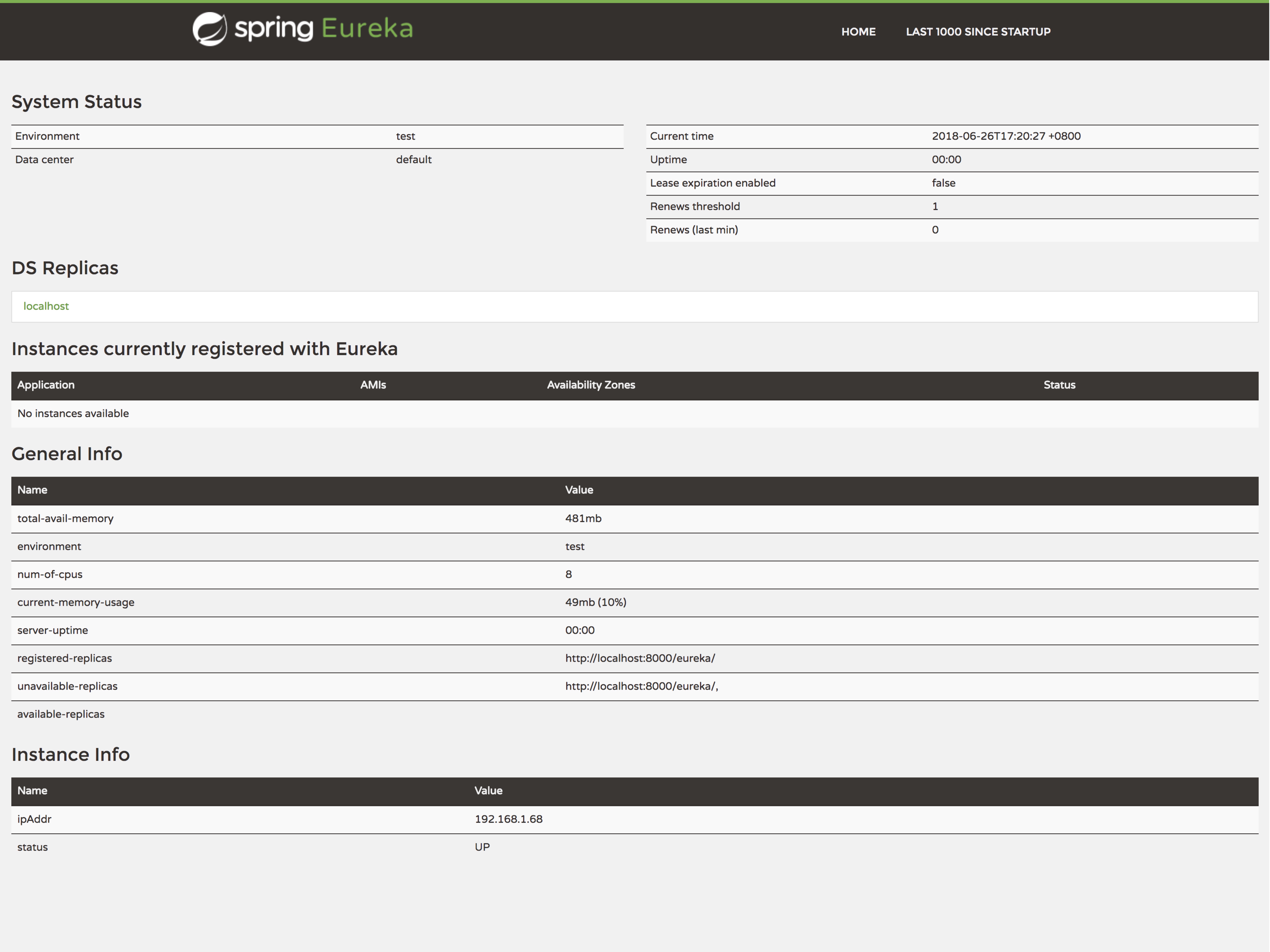 运行启动类,启动项目,访问 http://localhost:8000,看到 Eureka 的管理界面: