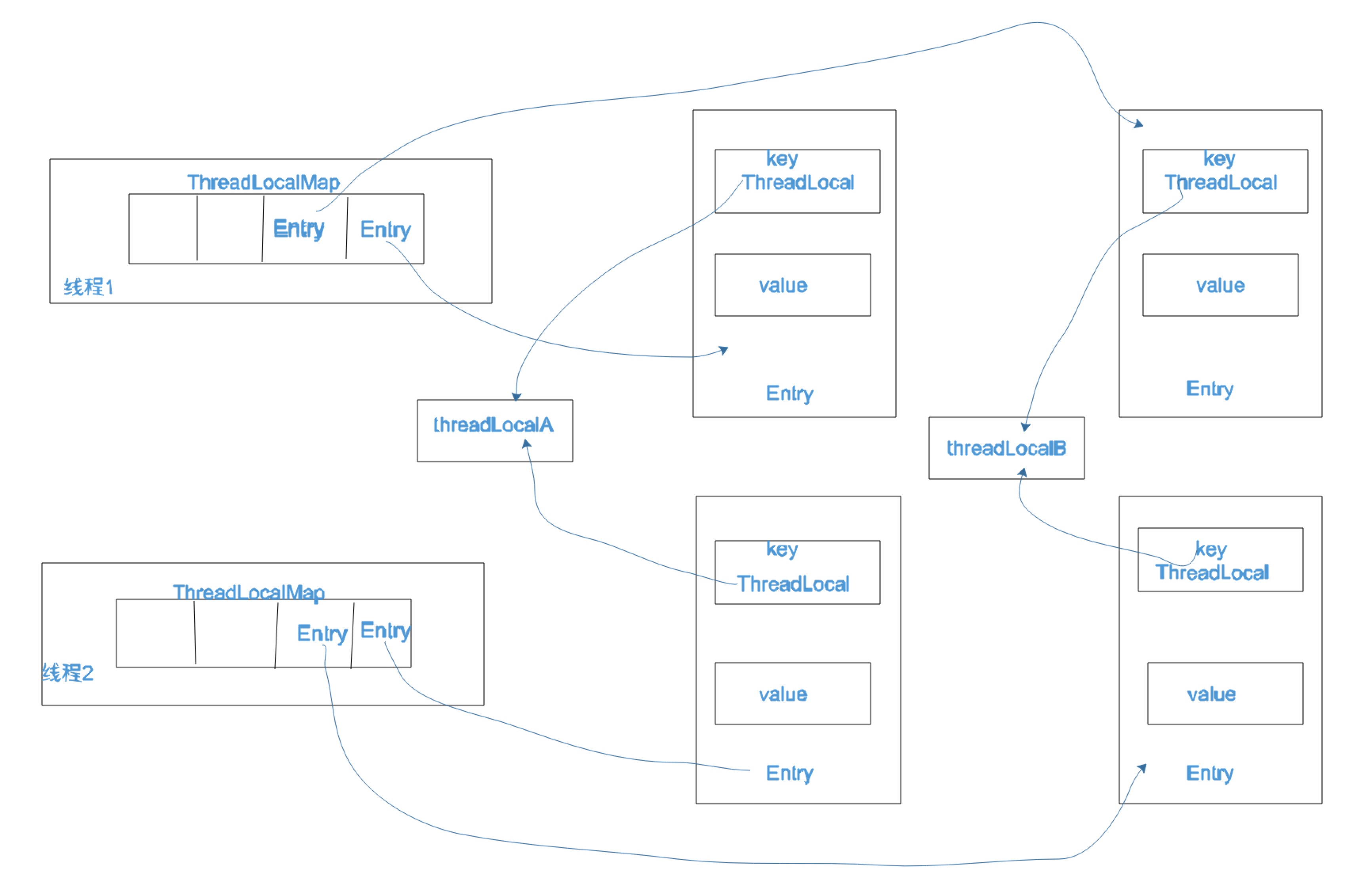 每个Thread内有一个 ThreadLocalMap,这个 ThreadLocalMap 的 每个 key 就是 每个ThreadLocal 对象(THREAD_LOCAL_A、THREAD_LOCAL_B),value 是变量副本。