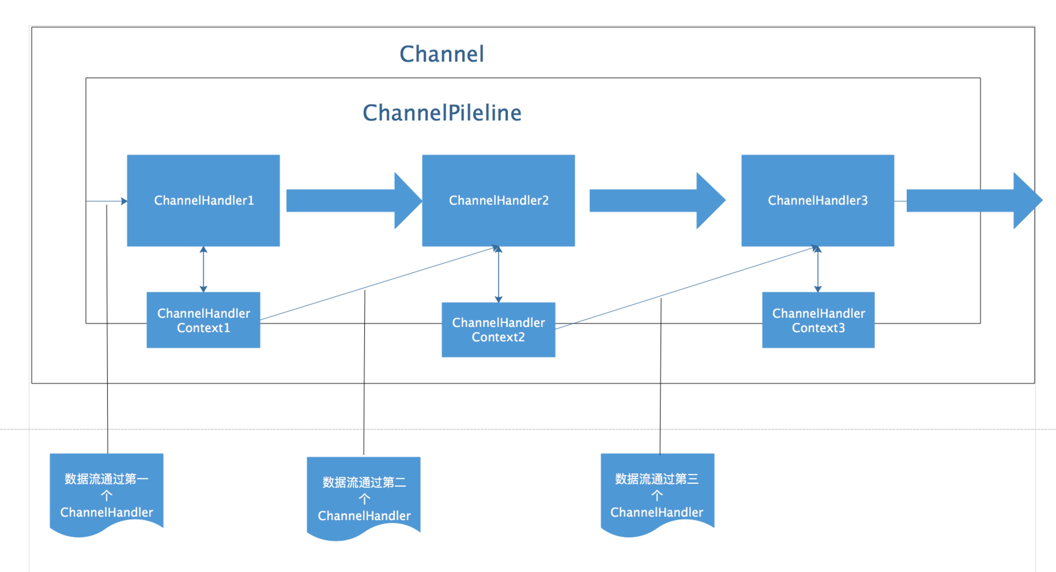 每个 ChannelHandler被添加至ChannelPipeline 后,都会创建一个 ChannelHandlerContext 并与 ChannelHandler 绑定,ChannelHandlerContext的功能主要是让与自己绑定的 ChannelHandler 与其他的 ChannelHandler 交互,因为 ChannelHandler 是链式执行的。