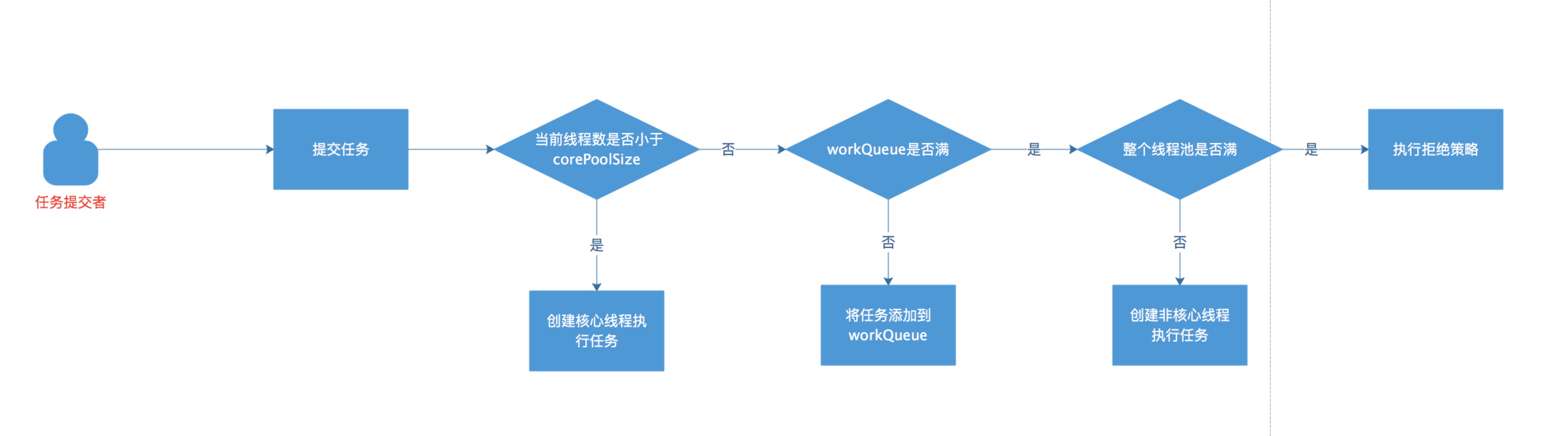 workQueue 是一个阻塞队列,当提交任务时,判断顺序:先判断核心线程数量,再判断 workQueue 是否满,最后判断整个线程池是否满。