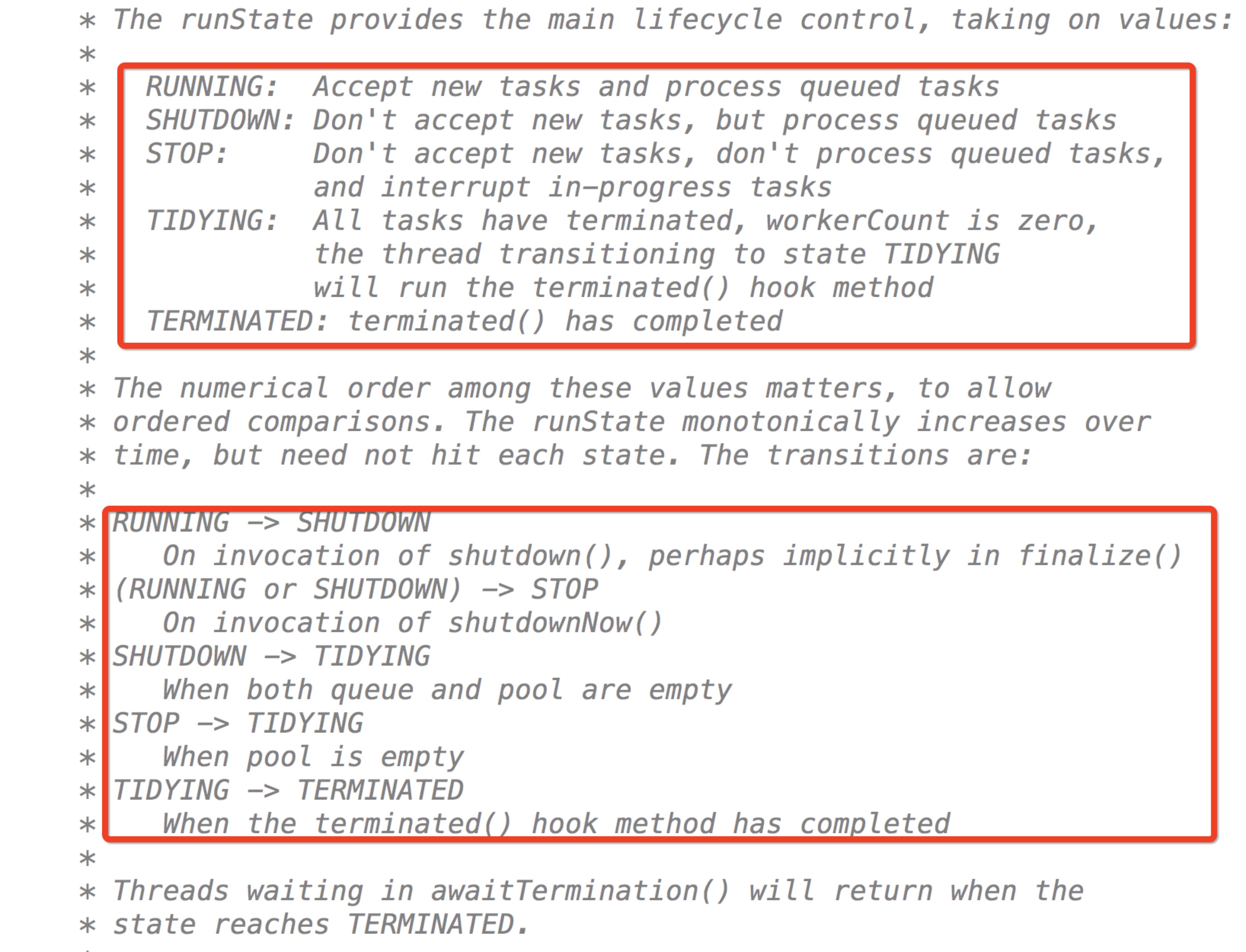 TIDYING:我的理解这是一个过渡状态,所有任务都执行完毕时,在线程池终止前会变为此状态。每次执行 shutdwon()和 shutdownNow()都会做相应判断是否更新为此状态。